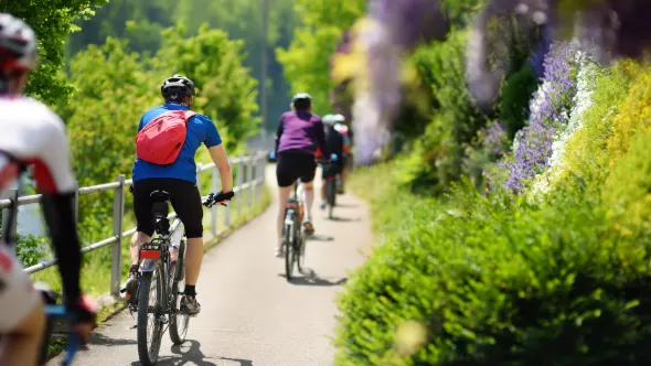 Fietsers rijden achter elkaar op een smal pad, omgeven door groen